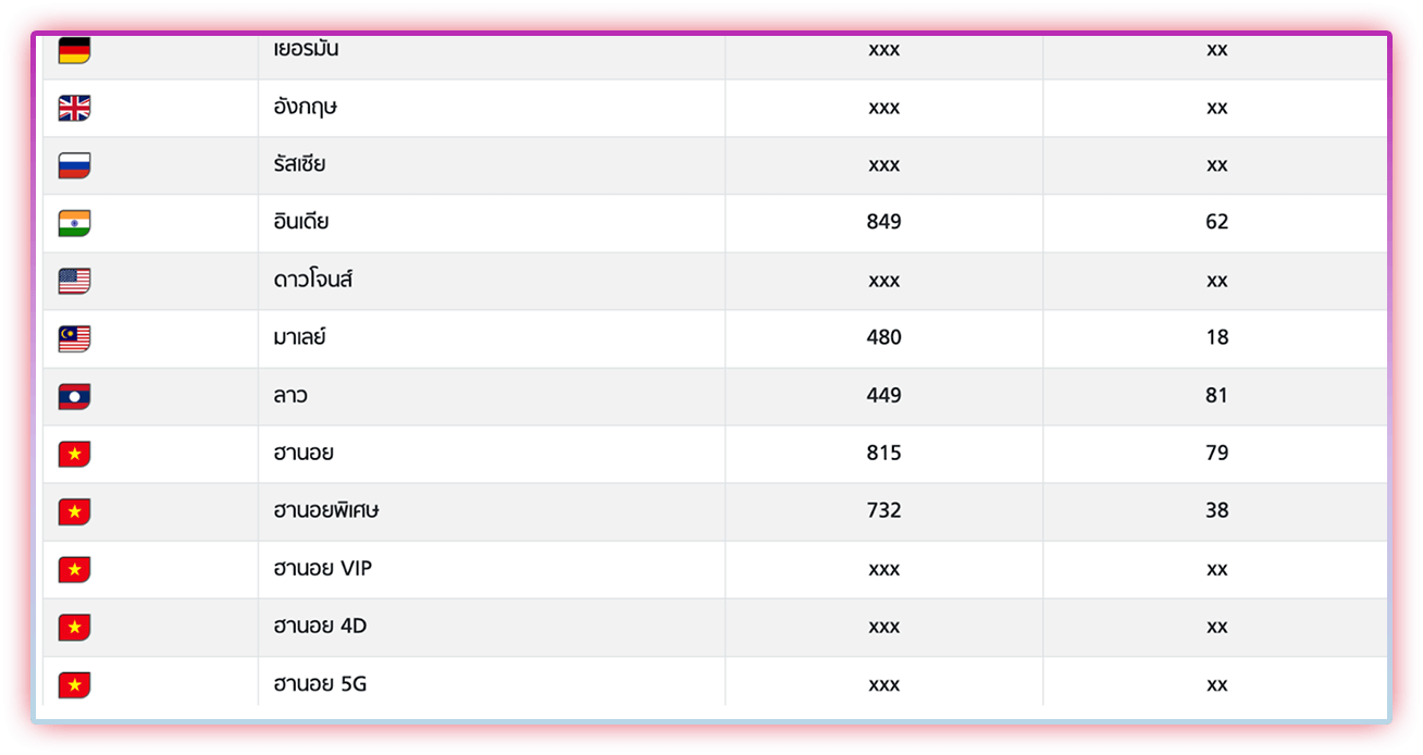 จากภาพด้านบนที่เราเห็น นี่คือส่วนหนึ่งของการออกผลของประเภทหวยที่เราเปิดให้บริการในเว็บของเรา นอกจะจะสามารถซื้อล่วงหน้าได้ ยังเลือกจ่ายรางวัลตัวเลขที่ไม่อั้น เริ่มต้นในการเดิมพันที่ 1 บาท ไม่ต้องผ่านคนกลางในการเล่น เรามี User ID ที่แทงเดิมพันในการเล่นได้ครบทุกการแทง ซึ่งเรามีประเภทการเดิมพันหวยสุดฮิตดังนี้