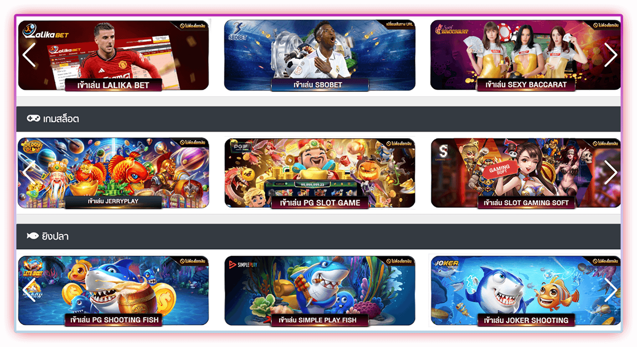 ตัวค่ายที่เปิดให้เล่นสมาชิกก้จะได้อัปเดทเพิ่มตลอด รวมถึงเกมสล็อต เกมยิงปลาที่เราจะได้เล่นเกมใหม่จากหลายค่ายมากกว่า 25 ค่าย เล่นให้เต็มอิ่มใช้กระเป๋าเครดิตเดียวกันไม่ต้องโยกเงินเลย สนุกให้เต็มที่ บริการกำไรที่ได้รับไปได้ในทุกเกม