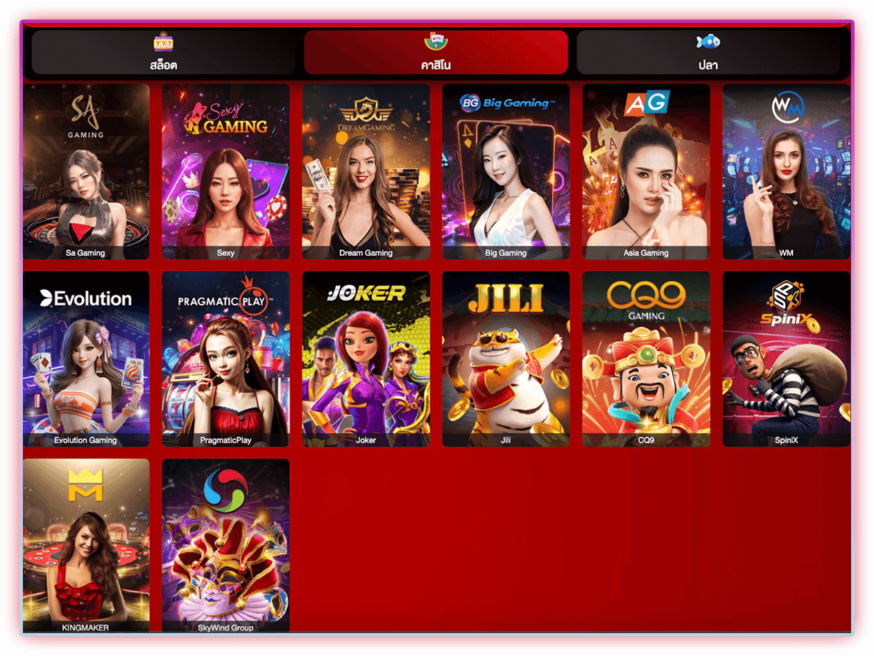 อีกเมนูหนึ่งที่ถือว่าเป็นประเภทการเดิมพันที่ได้รับความนิยมไม่แพ้กัน ก็คงเป็นเกมคาสิโนที่เราเล่นสดได้ตลอดทั้งวัน ซึ่งจากภาพด้านบน จากภาพด้านบนเราจะเห็นได้ว่ามีหลากหลายค่ายเกมผู้ให้บริการ มีประเภทการเดิมพันหลักๆอย่างเช่นเกมบาคาร่า เกมเสือมังกร เกมรูเล็ต และไฮโล โดยจะมีเสริมเอกลักษณ์ของการเดิมพันแต่ละค่ายเพื่อดึงดูดให้สมาชิกเข้าไปใช้บริการที่แตกต่างกันออกไป